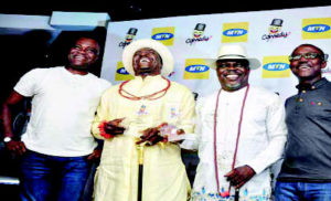 L-R: General Manager, Brands and Communications, MTN Nigeria, Richard Iweanoge; veteran comedian, Ali Baba; ace producer, Opa Williams and Sales and Distribution Executive, MTN Nigeria, Adekunle Adebiyi share a joke